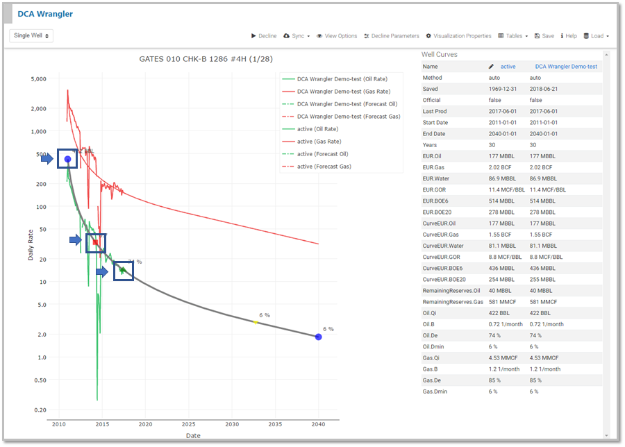 After the decline has run for a well and the user is in the Single Well View, the user can edit the decline curves for each stream with hotkeys (as described in the Help Menu) or by using the control points right on the plot itself. As the user adjusts the curve, the parameters update in real-time and are overlaid on the chart.