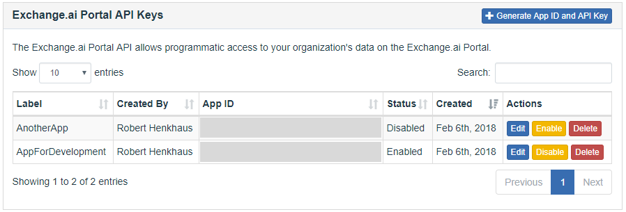 The Exchange.ai Portal API Keys Panel allows the Portal Admin to create and retrieve Portal API Keys. The Exchange.ai Portal API allows programmatic access to the organization's data on the Exchange.ai Portal.