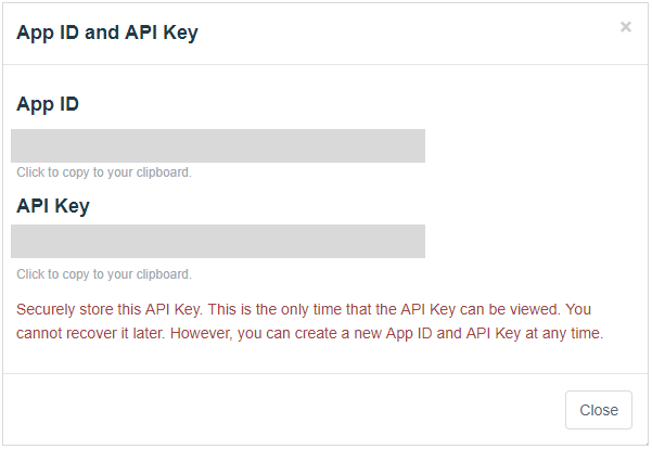 | + Generate App ID and API Key | Click to create a new App ID and API Key. Securely store the API Key. This is the only time that the API Key can be viewed. It cannot be recovered later. However, Portal Admins can create a new App ID and API Key at any time. |