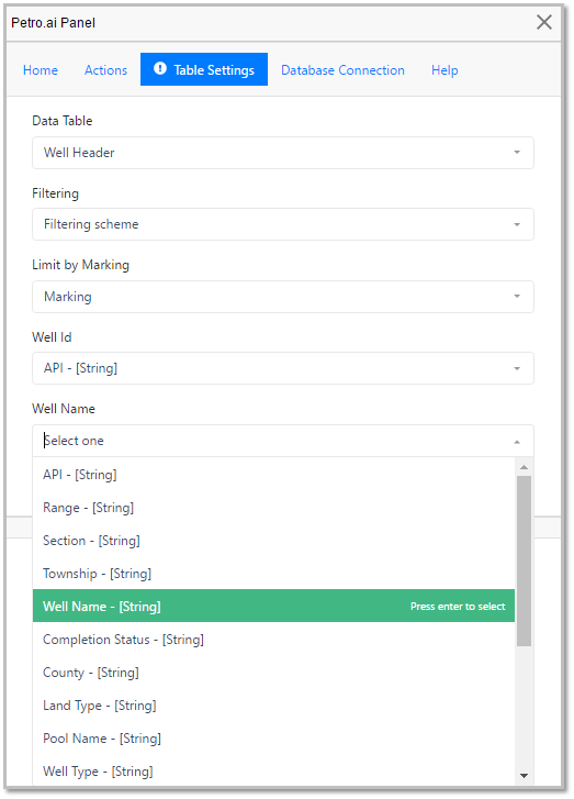 The Table Settings menu tells the Petro.ai Panel which table, filter, marking, and columns to use when saving data to the Petro.ai DB.